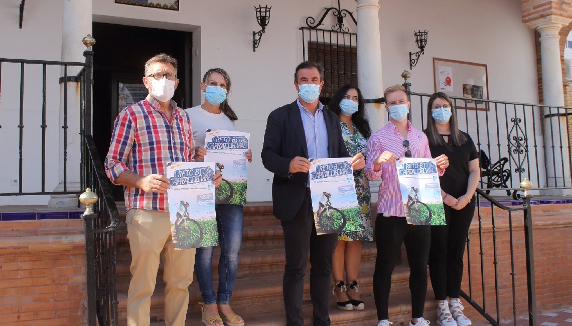 El alcalde de la ciudad, Rubén Rodríguez, acompañado por el concejal de Deportes, Álvaro Iglesias, las concejalas de Servicios Sociales, Rocío Márquez, y la de Atención y Participación Ciudadana, Mercedes Cano, junto a los corredores María José Ruiz y Santiago Iglesias, han presentado en nuestra localidad el I Reto BTT Capital del Vino que se celebrará en Bollullos los próximos 2 y 3 de octubre.