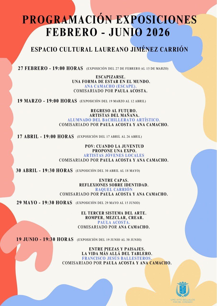 La Concejalía de Cultura del Ayuntamiento de Bollullos Par del Condado presenta la programación expositiva del Espacio Cultural Laureano Jiménez Carrión para el primer semestre de 2026, una propuesta que se desarrollará desde febrero hasta junio y que reunirá exposiciones individuales y colectivas con perfiles y enfoques diversos.